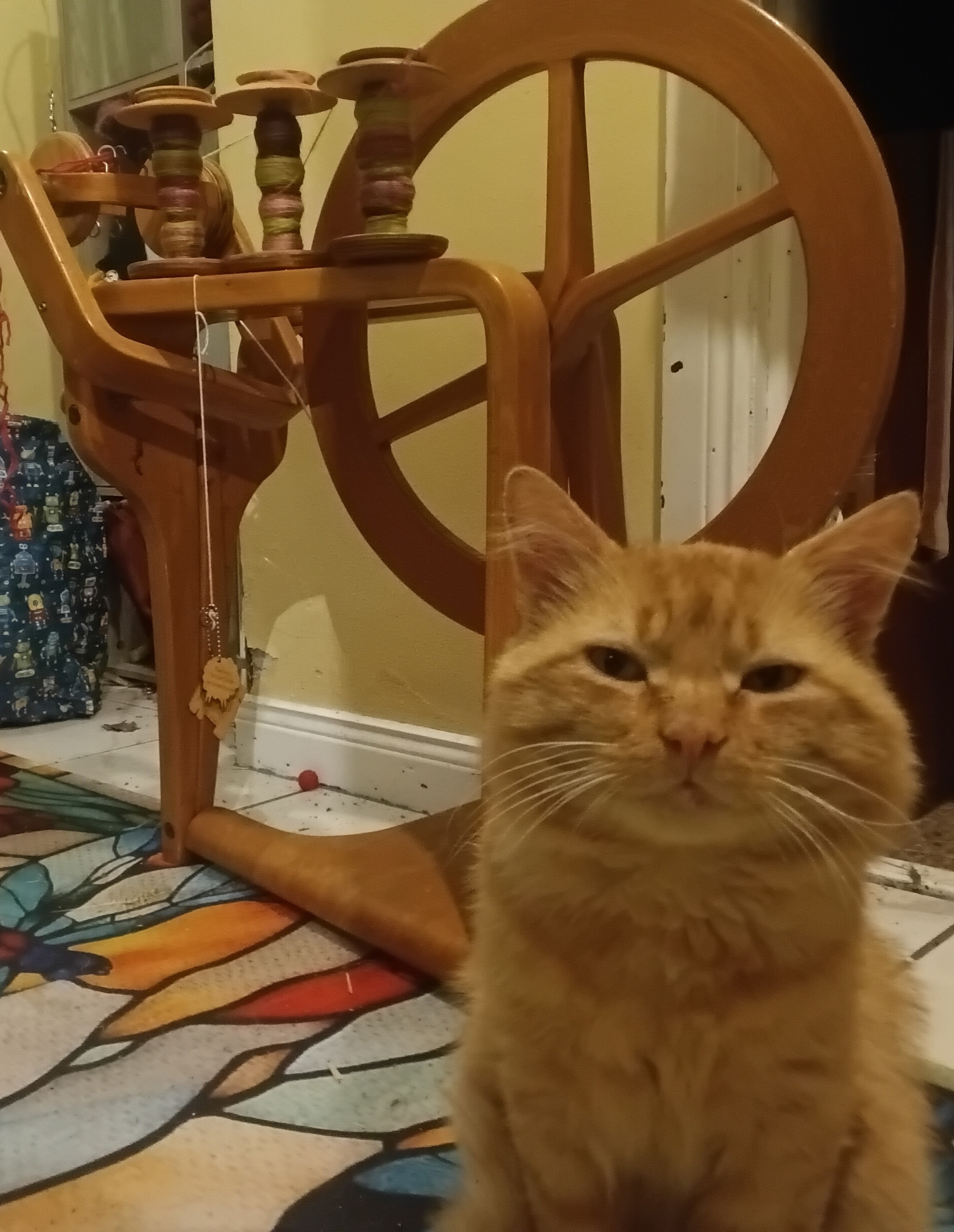 In the background, a Herring Gordon wheel with 3 bobbins on its integrated Lazy Kate.  Foreground: a large ginger cat, looking smug.