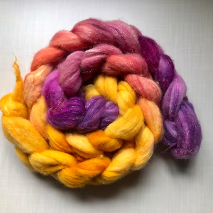 Then, because I enjoyed spinning the rose/olive Merino Tencel braid from stephscraftybits, I bought some more of her braids! One is a Merino Tencel braid in sugared-almond colours that remind me of Jean Harlow’s evening dresses, rose, brown, grey and powder blue.