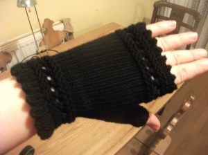 The black gloves are a pair I made for my teaching placement mentor. The pattern is Susie’s Reading Mitts from Dancing Ewe Yarns, and I used one skein of Katia Merino 100%. Looks great, and can be used for wiping a whiteboard at a pinch.