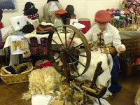 The hall was bustling quietly. Someone was doing a demo of spinning in historical costume, on a very large, very homemade looking wheel. I couldn’t place the era, and don’t know enough about spinning to identify any more than that, and was still feeling too shy to stop her and ask questions. There was a selection of fabulous felted hats, some military, on her stall, but sadly none for sale. The most amazing thing was a set of carders (?) that I didn’t even see until I was leaving the hall later. Instead of bristles, they had large burr seeds attached! That just amazed me. Of course, what would you use before manufacturing gave you the option of inserted-bristle brushes? It’s so obvious and ingenious.
