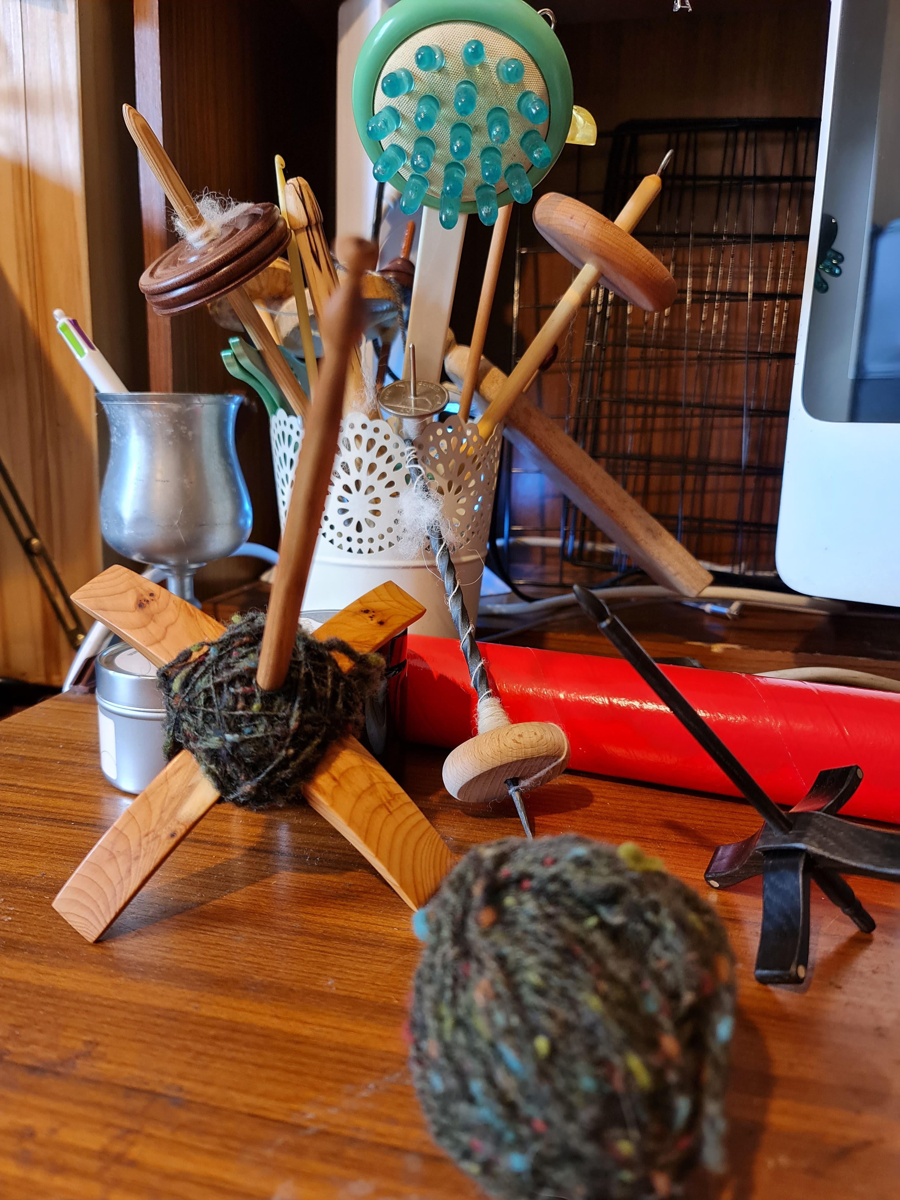 Eight hours later I picked myself off the floor where I’d fainted from hunger. But I had learned SO MUCH. Like I apparently have a Ashcroft Traditional, probably 1982, and it’s a double drive – but is set up as a single drive. And you guys, the whole maiden (?) thingy can be moved sideways! which lines up the groove on the flier with the groove on the wheel – which was the reason the drive band kept flying off – they weren’t aligned properly! It finally spun properly, but the yarn wouldn’t wind onto the bobbin, so I went down another rabbit hole where I spent an unreasonable amount of time trying to find a replacement whorl for my flyer (learning in the interim that I had a jumbo flier) before realising that Traditionals don’t have one (or at least they don’t have one that screws on after the bobbin…). Then I found a video showing how to put together a Traditional from bits of lumber without reducing it to kindling in the process as I was by then tempted to do… and this is where I learned about the fishing line thingy! Scotch tensioning! Which has nothing to do with Scotland, even though there’s an Irish tensioning which I still have to figure out.
