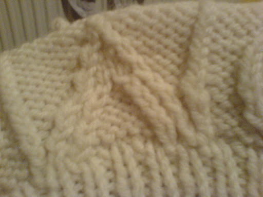 However, few months ago I bought some mystery wool in the Bull Ring. No bands, but cheap and with a very pleasant hand to it. It’s one single ply of many filaments, very thick, soft and warm, but lightweight and slightly fluffy. I thought it might possibly be wool, maybe a merino or something, but as soon as I’ve decided it almost definitely is wool, it starts looking synthetic, like what polar fleece would be like to knit with. It’s coming up chunky, 14st to 10cm – the moss-stitch panels look like bobbles! It isn’t pilling as I knit, which is unexpected if it’s synthetic.