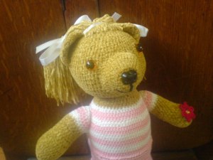 This is an heirloom teddy I made for my niece.I took a basic pattern I found in a craft shop and added a skirt with a pocket and hanky, socks, shoes, a flower and hair. The pattern was in dc throughout, starting with 6 or 8 dc in a looped chain, then increasing one dc every 1 stitch in row 1, every 2 st in row 2, etc, until you get the right width, then continuing straight until the length is right and decreasing in reverse to the increase. Before it closes, stuff the part with a suitable foam (I’ve used old stockings/tights before but these might not be so good for kid’s toys) and then finish. The ears are just a body shape, done up to the end of the increases, then folded and shaped before attaching.I used a chenille yarn for the furry bits, and thickish crochet thread for the clothing. I did a bit of shaping on the arms to suggest paws by decreasing on the row after the main increases ended. The eyes and nose came from another craft shop, and the mouth detail was satin stitch – about the only embroidery stitch I can do.To do the skirt I crocheted a chain into the body, then crocheted off that in rounds. I increased slightly at the bottom to get the flare, then did a scallop edge by crocheting 5tr into every third stitch at the bottom.The hair was sewn onto the shaft of the dcs along about a quarter on the head, then knotted to form 2 ‘hairs’. Once it was all in, I combed it into shape with a wide-tooth comb, trimmed the ends and tied it with the bows.