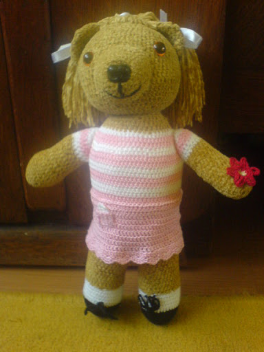 The flower was a simple loop chain with 10dc in yellow, the petals in red by *slst into dc, 4ch, ttr into same dc, 4ch and slst in same loop, 2ch, skip a dc, repeat from *. It was sewn into the paw using the tails of the cotton. The shoe laces are just chains tied into bows.