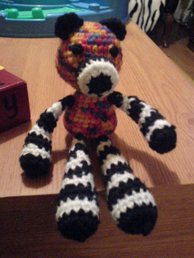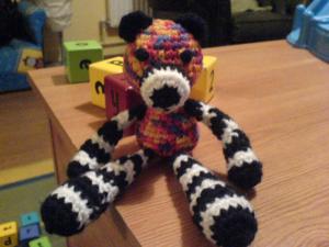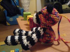 He is made with a TINY amount of multi-coloured yarn of unknown composition for the head and body. I think it is self-patterning sock yarn, though I have no idea how it came to be in my stash, it just was, being offensive and vile*. The black yarn is almost certainly wool, of a strange, ply-less, slubby nature, which I bought unbanded to make a sweater for Tiny Husband, as he has had nothing since his lovely purple pirate fingerless gloves (which reminds me, I really ought to get another pair on the needles for winter, possibly with a mittenly ‘hood’ for his fingers), and the white is some acrylic left over from my new niece’s matinee outfit (of which cuteness, later).