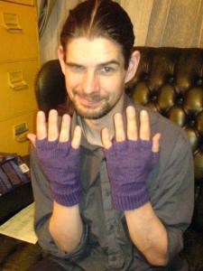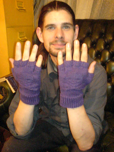 I mentioned a few posts back that I made my hubby a pair of purple fingerless gloves. He had had a pair, given to him by a friend, but they’d fallen apart. He’s not really a gloves person – doesn’t like having his fingers covered – but his hands do get cold, and he loved these smelly old raggedy things with a passion that struck me as inappropriate and slightly icky. I did want to knit something for him, thinking sweater, scarf, but when I asked what he wanted (because that’s the kind of thoughtful, caring spouse I am), his little eyes filled with tears and in a choked and pleading voice he asked for some new purple fingerless gloves.