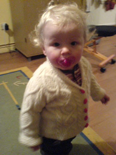 Sadly, this is the only pic I have of His Nibs in the cardi (Note to self: do not send colourblind husband to buy buttons). Not only had he outgrown it, but foolish Tiny Husband put it in a cottons wash (Note to self: stern laundry lecture to Tiny Husband). It hasn’t shrunk too badly, but has felted a bit – not that this is a disaster in traditional all-weather fishermen’s wear, of course. I should dig it out and palm it off on my niece, I think. Nephew’s mum would not be impressed at being given an oul secondhand shrunk thing!