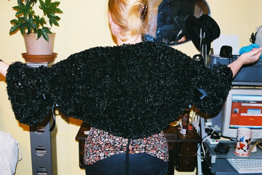 I only did the lacy bit up to approximately the elbows, then switched to two 4mm needles for the section over the upper arms and back, then back to the 10mm and 4mm needles for the other sleeve. Suspended bind-off gives a nice loose edge for this project. Sew up the lacy section of both sleeves right up to about 1-2in of the non-lacy middle section. The type of sewing up doesn’t really matter, as the fluffiness of the yarn disguises the neatiness/tidiness of the stitchwork – I’ve even crocheted up the sleeves on some of these shrugs and it’s not noticeable. Then, to tart it up a bit, I threaded a length of 1in black ribbon through the top row of holes in the lace and tied it in a bow opposite the seam – the bow is then on the outside of the arm. Finito!