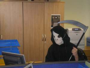 The cloak is borrowed, and the plastic scythe came from a charity shop. I didn’t bother with the mouth as a) I had no time, b) it involves ~shudder~ embroidery, and c) hubby promised to do it then wimped out.